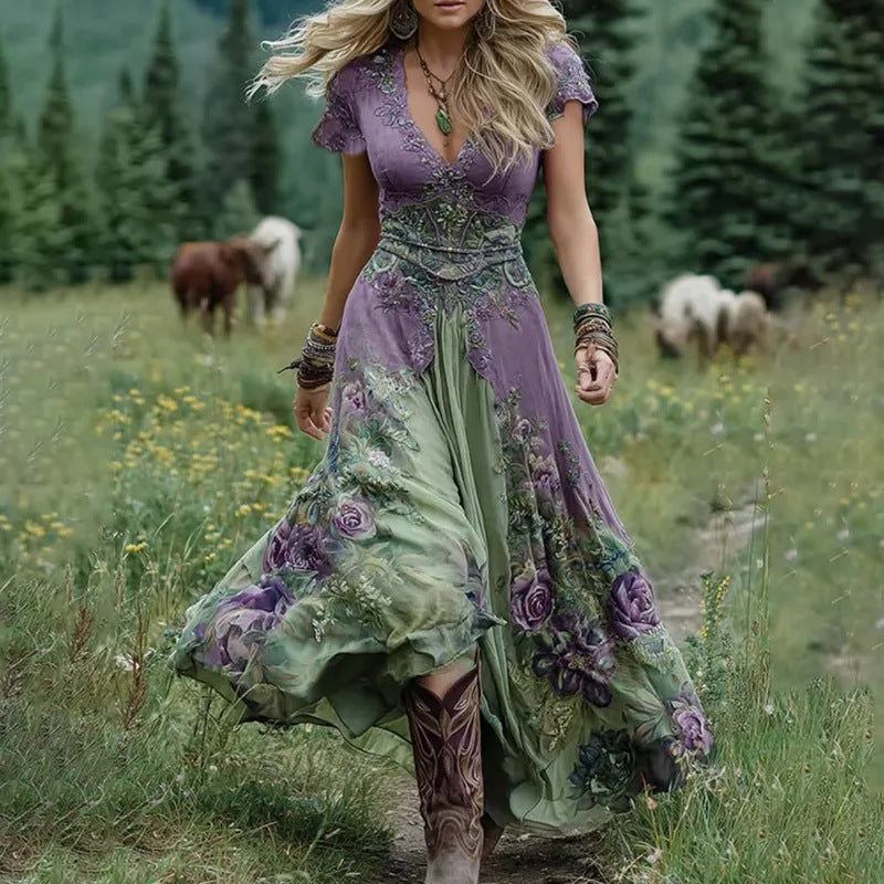 Totem-printed women's V-neck mid-length dress